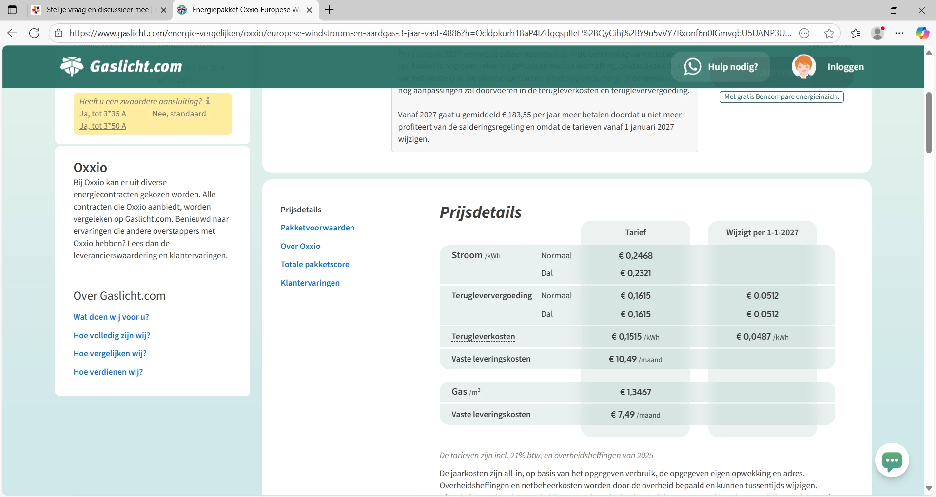 Er is een grote energieleverancier die al zijn tarieven voor na 1-1-2027 bekend heeft gemaakt. En waar je nu al een, dus een twee- of driejarig contract kan aangaan. En wat blijkt: Geen netto terugleverkosten. Oxxio betaalt voor de teruggeleverde stroom netto € 0,0025 per kWh (een kwart cent dus). Zijnde € 0,0512 terugleververgoeding minus € 0,0487 terugleverkosten.