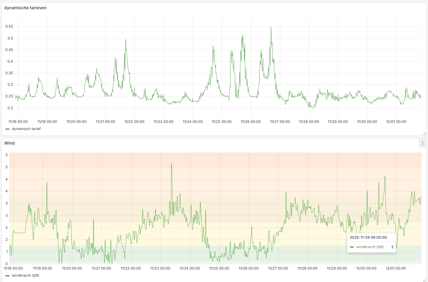 Voordeel van een dynamisch contract is dat je vooral in de winter kan profiteren van lage elektriciteitsprijzen als er 's nachts en in het weekend veel wind staat.